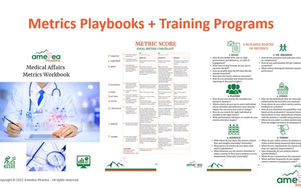 Develop a comprehensive and dynamic Medical Affairs Metrics Playbook customized for your organization by specific MA function (example available upon request). We have developed a 29-page interactive template playbook that includes a step-by-step guide to strategically align metrics to company and Medical Affairs goals, a 10-item Metrics Score assessment, 6 building blocks of questions with corresponding sets of questions and variables, background management case studies, and definitions.