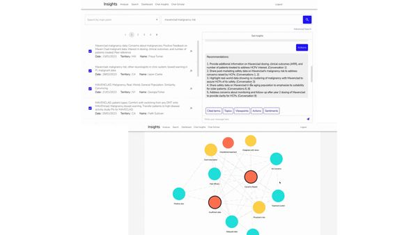 Generative AI large language model (LLM)-based Medical Insights application based on large language models that translate the search and exploration into a natural conversation in a chat format, summarize meeting notes, reveal key topics, viewpoints and sentiments, and generate actionable recommendations, akin to conversing with a knowledgeable companion.